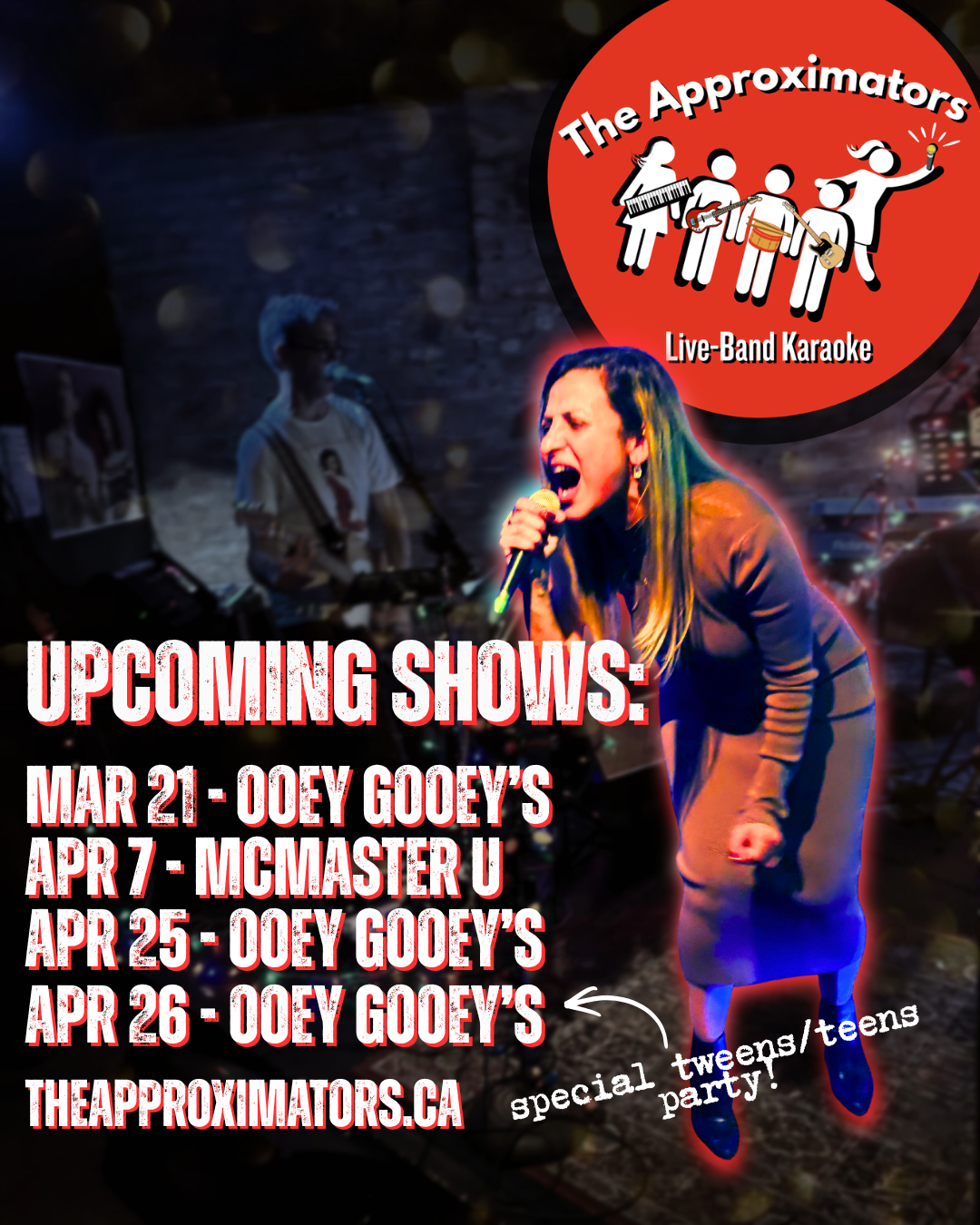 The Approximators are a live karaoke band based in Hamilton, Ontario. We play almost every month at Ooey Gooey’s in Hamilton’s Hess Village neighbourhood, plus private parties and other events. The shows are fun and lively and 100% judgment-free.